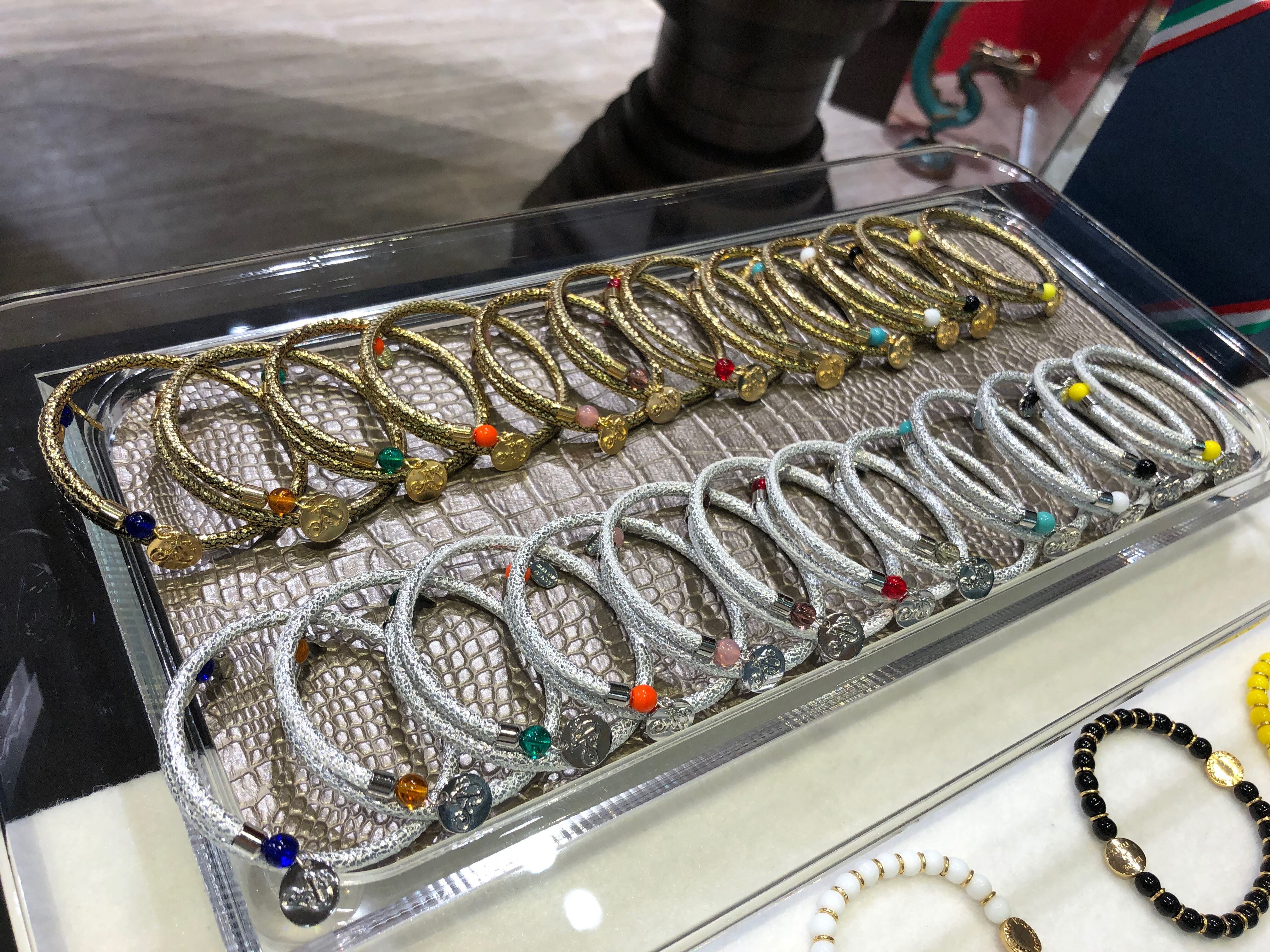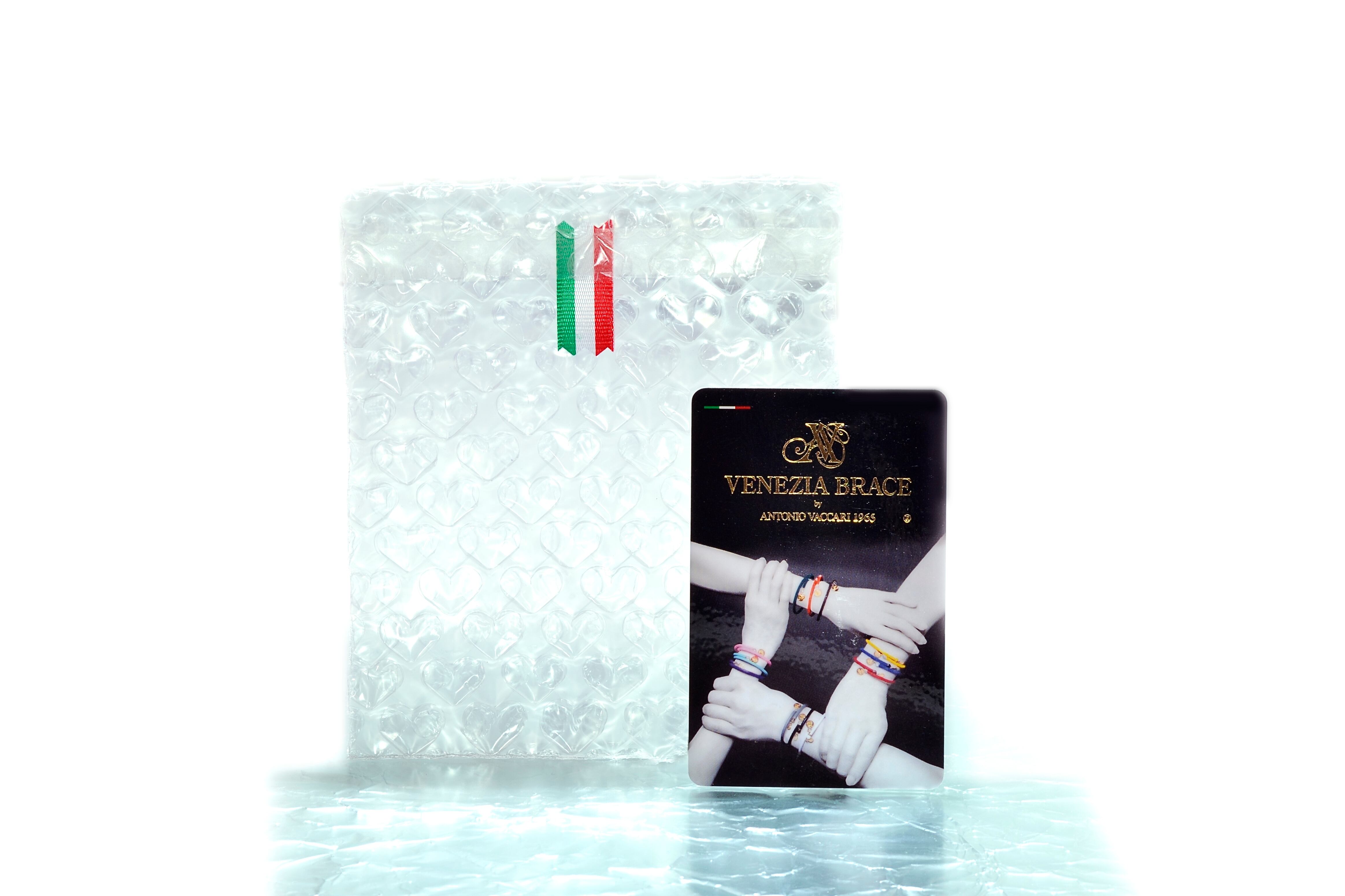 Eco Leather(合成皮革/EL)を採用しています。Caucciuモデルと同様に形状記憶ワイヤーを用い、タグにはAV(ANTONIO VACCARI)、MADE IN ITALY&MURANO GLASSの刻印、トップには12色のガラスが使われています。 ゴールド(金運)は愛用するに連れ、EL部分がゆっくりと金から黒に変わっていきます。ゴールド/金運→黒/力強さ シルバー(開運)は愛用するに連れ、EL部分がゆっくりと銀から白に変わっていきます。愛用して行くに連れ、愛用者の使用スタイルにより、新品とは異なる風合いを楽しむ事ができます。